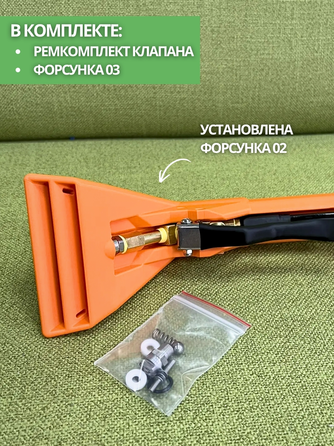 Установлена 02 форсунка, в комплекте запасное стекло, ремкомплект клапана, форсунка 03.