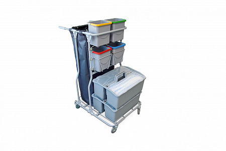 Элементы тележки собираются при помощи болтового соединения и пластиковых элементов. Сборно - разборная конструкция позволяет снизить издержки связанные с транспортировкой и складским хранением. В разобранном виде тележка занимает всего 45% от собранного состояния.Тележка комплектуется двумя 2х секционными ведрами с откидными крышками для складирования чистых или грязных мопов, и четырьмя ведрами объемом 4л для влажных салфеток или различных расходных материалов, инвентаря, химии. Верхний ряд малых ведер вынимается вертикально вверх, нижний ряд малых ведер устанавливается в металлические корзины, которые крепятся на двойные пластиковые петли, которые обеспечивают компактное размещение при этом сохраняют удобство использования малых ведер.