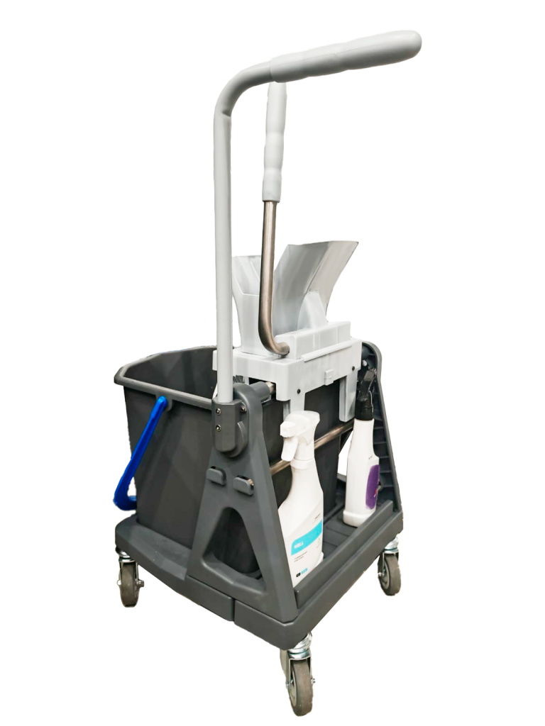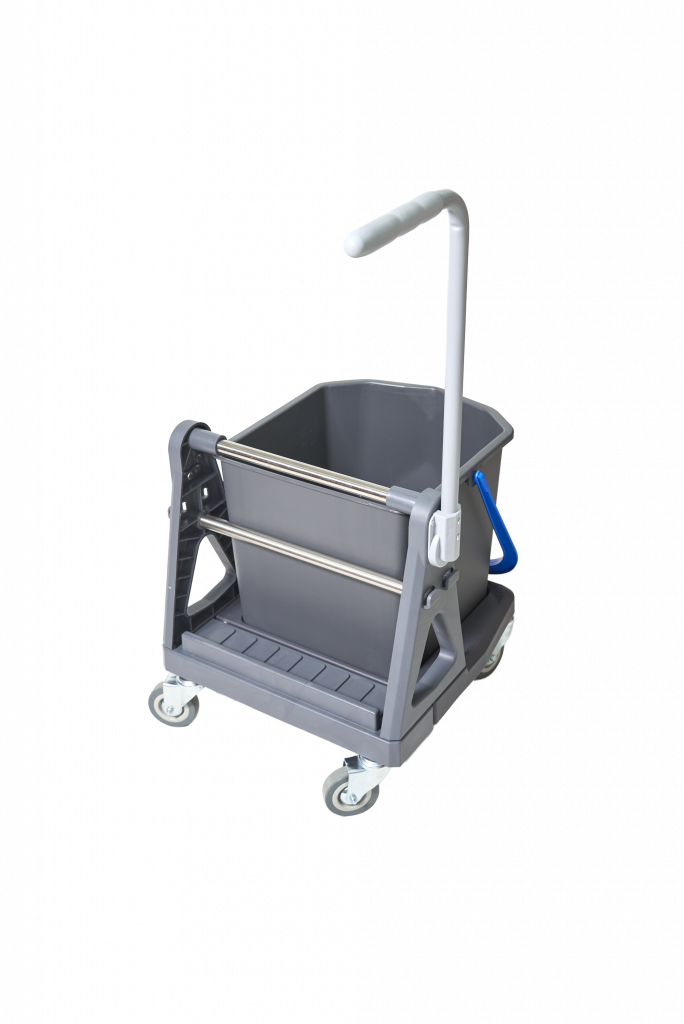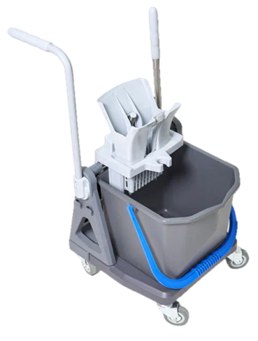 Маневренная тележка комплектуется одним ведром емкостью 25 литров (имеют цветовую кодировку), лотком для распылителя и прочей мелочи и отжимом Росмоп Кваттро с клипсой. Рукоятка выполнена из крашенного полимерной краской металла, что облегчает реставрацию рукоятки при длительной эксплуатации.